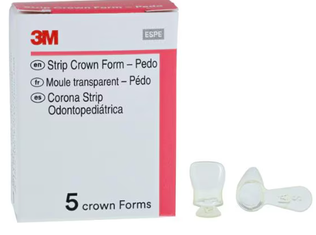 Prefabricated, transparent strip crowns for primary anterior applications. The strip crowns are ideal for use with chemical or light-cured composites. Refills of individual primary anterior strip crowns are available in boxes of five.