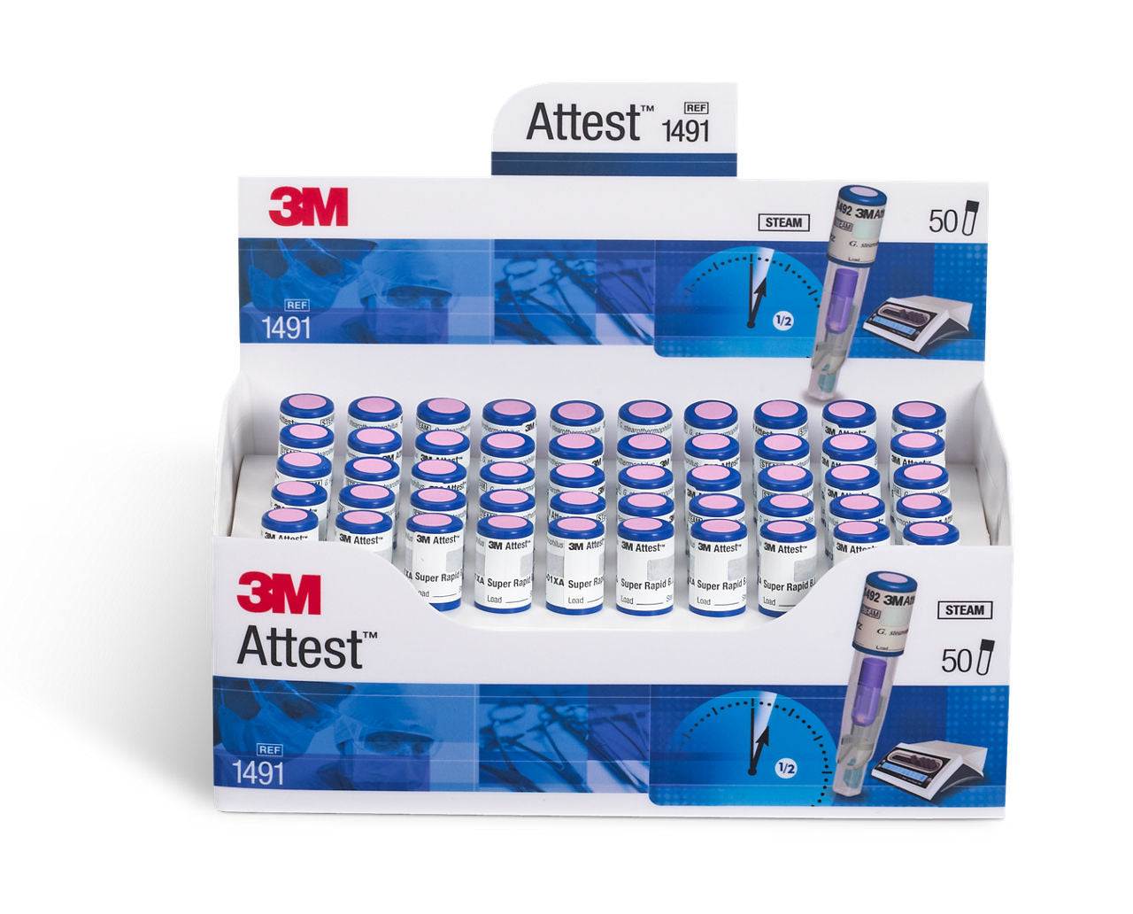 The 3M™ Attest™ Super Rapid Readout Biological Indicator 1491 is a self-contained biological indicator specifically designed for rapid and reliable qualification testing and routine monitoring of 270°F (132°C) and 275°F (135°C) gravity-displacement steam sterilization processes when used in conjunction with the 3M™ Attest™ Auto-reader 490 or the 3M™ Attest™ Auto-reader 490H with software version 4.2.7 or greater. The self-contained design includes a spore carrier with spores of Geobacillus stearothermophilus and a media ampoule containing bacteriological media. The spore carrier and media ampoule are contained in a plastic vial topped with a blue cap. A chemical process indicator which changes from pink to light brown or darker upon exposure to steam is located on the top of the cap.