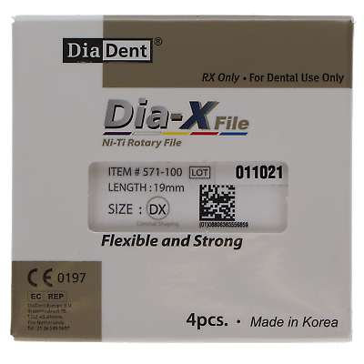 Dia-X Rotary Files are comparable to the popular rotary file system in the market today. It provides 143%+ the resistance to cyclic fatigue than Dia-PT Rotary Files. Dia-X Files feature the same exact geometries as Dia-PT Rotary Files; however, the heat-treated premium nickel titanium construction offers extreme flexibility and durability.