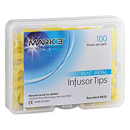 Infusor Tips Bent 100/pk by MARK3 are Single use disposable tips. Curved cannula for optimal entry. Soft bristle end allows for nonevasive brushing of solutions. Universal luer lock style hub. Padded brush end. Pre-Bent 19 Gage