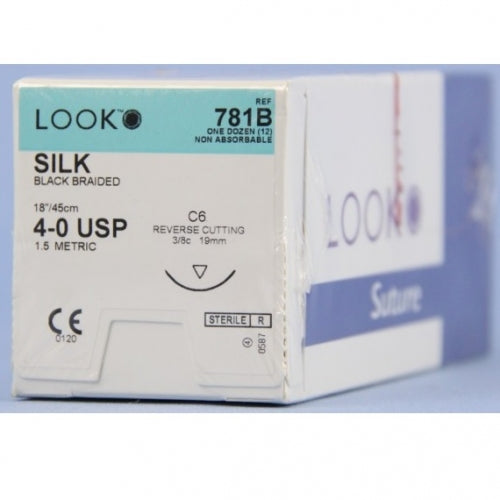 Look Sutures Silk Black Braided, 4-0, 18" Length, C6 Needle 12/Box #781B