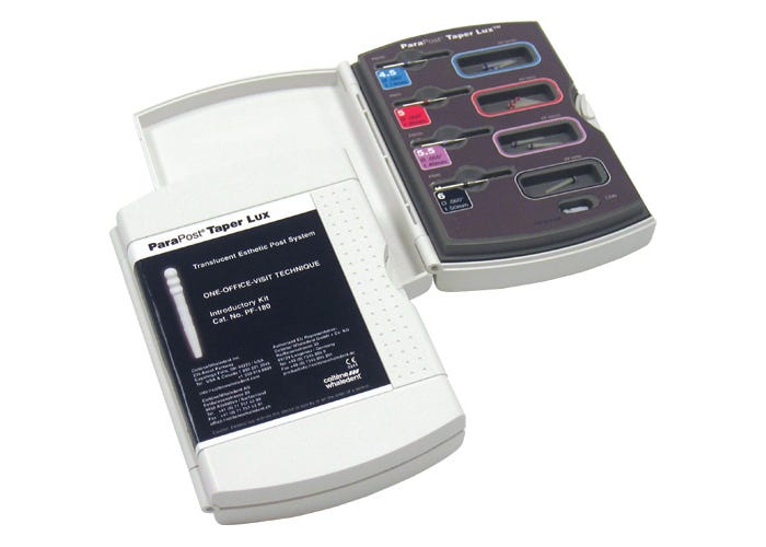 ParaPost Taper Lux offers clinicians a post that requires less removal of apical dentin in narrow canals, and provides a closer fit in canals prepared with crown-down greater taper file technique. Designed with 1/3 taper (.04) and 2/3 parallel sided. Taper Lux is available in 4 sizes, and requires a Tapered Drill. Contains: 15 assorted posts, 4 taper lux drills, 1 universal hand driver