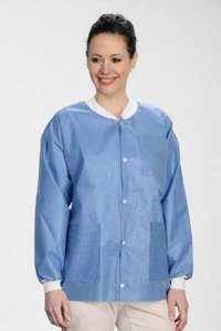 Protect Plus Lab Jackets provide 3 soft layers of SMS fabric(45g weight). These breathable and fluid resistant jackets are latex and static free. They contain 1 breast pocket, 2 hip pockets with knit cuffs and collar and a snap front.