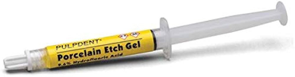A one-minute application etches porcelain crowns, veneers, inlays and fractured porcelain surfaces prior to bonding. This superior quality porcelain etch gel will not stain porcelain, composites or resin cements.